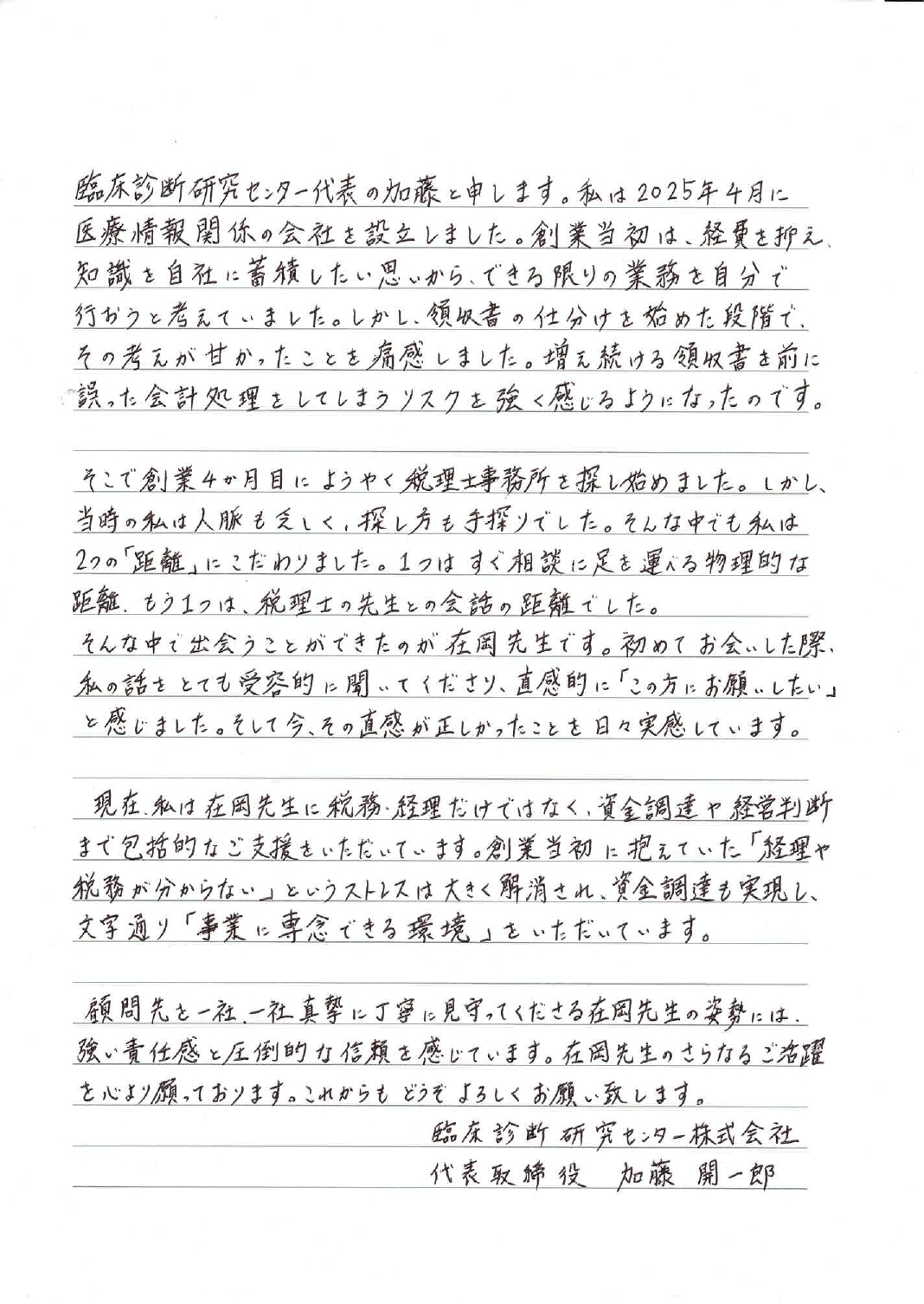 臨床診断研究センター代表の加藤と申します。私は2025年4月に医療情報関係の会社を設立しました。創業当初は、経費を抑え、知識を自社に蓄積したい思いから、できる限りの業務を自分で行おうと考えていました。しかし、領収書の仕分けを始めた段階で、その考えが甘かったことを痛感しました。増え続ける領収書を前に誤った会計処理をしてしまうリスクを強く感じるようになったのです。